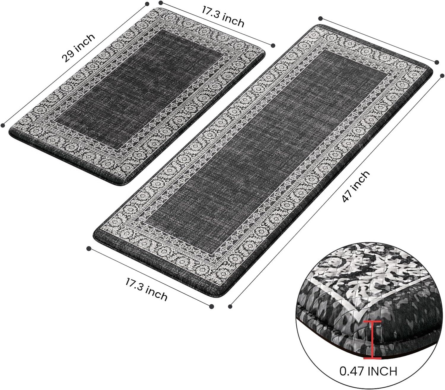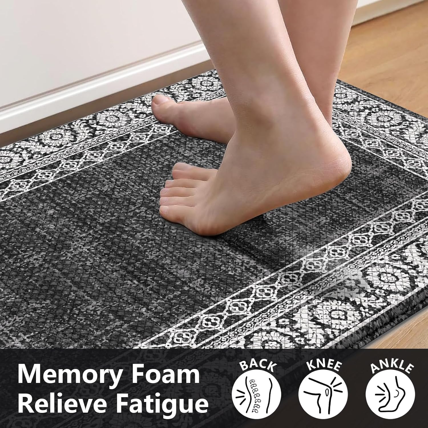 Introducing the LEEVAN Kitchen Rugs Non Slip, a set of 2 cushioned kitchen floor mats that are designed to provide comfort and support while standing for long periods of time. These black anti-fatigue kitchen mats feature waterproof materials and an ergonomic memory foam construction to help reduce strain on your feet, legs, and back.